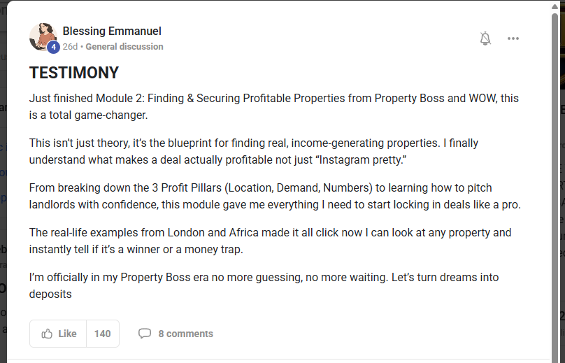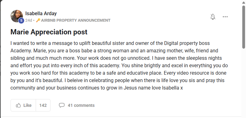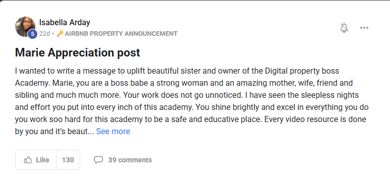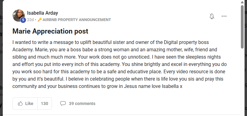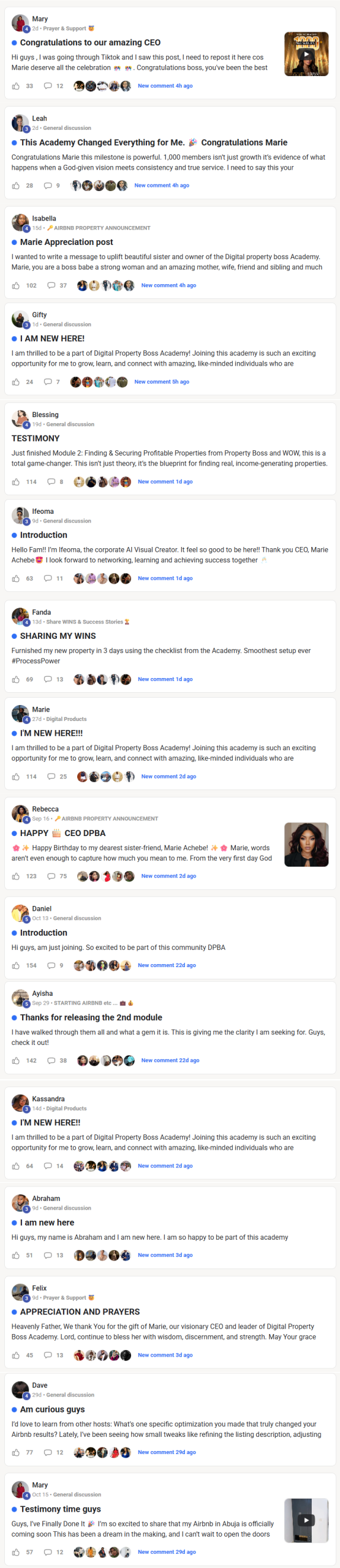 Through the Digital Property Boss Academy, Marie is now on a mission to democratize wealth creation. She created DPBA to help other women achieve what she has: building real online income without overwhelm, burnout, or guesswork. Her philosophy is simple: success doesn’t require millions in capital; it requires the right knowledge, mindset, and execution.